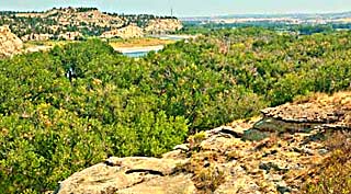 view NE. North face of Pompeys Pillar on river, far rt. |