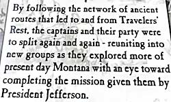 Travelers'Rest not only served the Corps on its forward progress, but was a staging site for the return journey. Captain Lewis trekked to the Great Falls area (red arrow). Captain Clark returned to Three Forks (blue arrow).