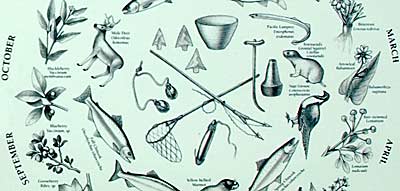 Rock SP. Right, seasonal flora and fauna decorate a native calendar.