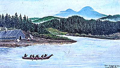 painting, right, depicts the life style of a Chinook village. Saddle